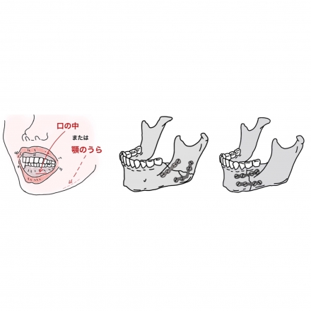 下顎骨骨折では骨折の部位に応じて口の中や顎の下、耳の前などを切って開き、正しい咬み合わせが得られるように骨折した骨を戻した後、プレート固定や歯にワイヤーゴムをかけて上顎と下顎を固定する方法を行います。
